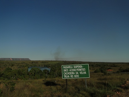 A entrada da Cachoeira da Velha fica exatamente a 70KM de Ponte Alta do Tocantins, TO, porém até a cachoeira são mais 30KM. Percorremos 20KM e chegamos a portaria de entrada da cachoeira que é controlada pela ADETUR, a primeira coisa que perguntamos "Aonde fica o camping" e recebemos como resposta "Aqui não existe camping, não é permitido acampar na Cachoeira da Velha". Na hora pensamos... ferrou vamos ter que enfrentar mais 120KM de estrada à noite, mas logo o pessoal nos tranquilizou, era possível acampar na sede, mas na cachoeira não. Resolvemos então conhecer a cachoeira e a prainha para depois montarmos acampamento.
