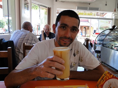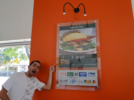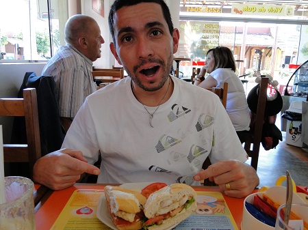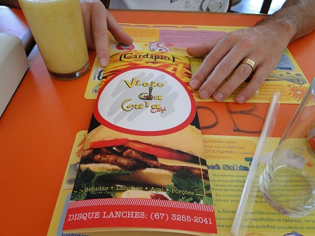 Nosso próximo atrativo do dia era no aquário natural, mas nosso horário estava agendado para às 14h, resolvemos encontrar algum lugar para almoçarmos no centro da cidade. Encontramos uma lanchonete "Vicío da Gula", descobrimos que lá é vendido um lanche de jacaré, o X-Jacaré, imaginem qual o lanche que o Beto escolheu... lá vamos nós experimentar o lanche de jacaré, junto com um suco de uma fruta da região a Guavira. Totalmente aprovados, indicamos tanto o suco como o lanche para todos que visitarem Bonito, MS.