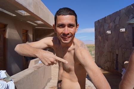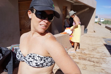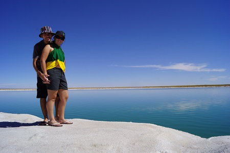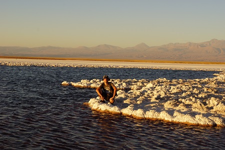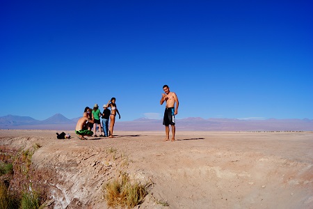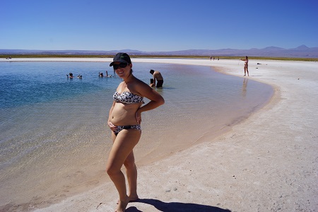 De Toconao fomos direto para a Laguna Cejar, famosa pela alta cocentração de sal na sua água que não permite que o nosso corpo afunde. É uma sensação completamente estranha, você pode tentar afundar de qualquer jeito que não vai conseguir. A concentração de sal é tão grande que logo ao sair da Laguna você começa a sentir a pele repuxar e começa a ficar completamente branco de sal. Além disso existe um segundo lago apenas para fotos e um terceiro lago com alguns Flamencos.