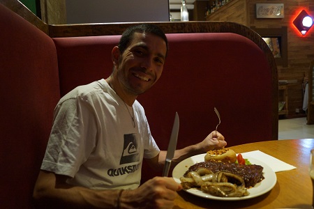 Aproveitamos também para almoçar de verdade, comer arroz e feijão, queriamos lembrar do gosto da comida brasileira. Para isso escolhemos a cidade de Santa Maria, RS, pois ficava bem no meio do caminho. Mapeamos no GPS um restaurante chamado "O Gauchão" e fomos até o local, chegamos um pouco tarde e o restaurante estava completamente vazio, ficamos impressionados com a atenção e precupação dos proprietários com a gente, foi muito bom almoçar ali. Depois do almoço ficamos batendo um papo com o pessoal do restaurante, fizemos amizade com o Sr. Sidnei, explicamos nosso trajeto, aonde passamos e demais coisas da viagem.