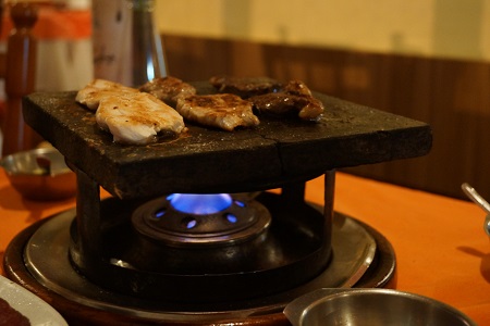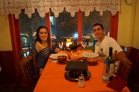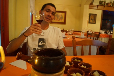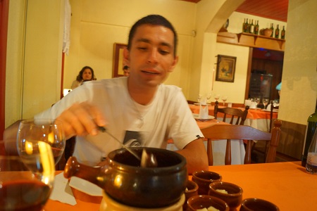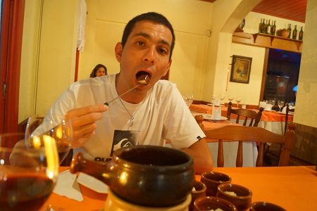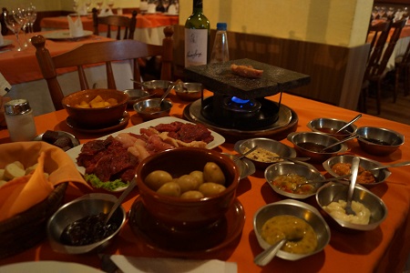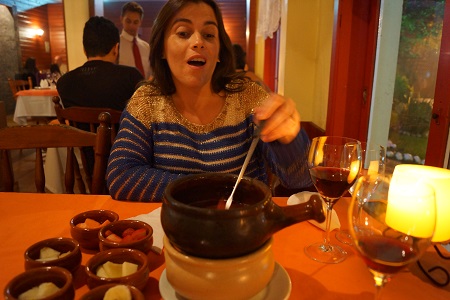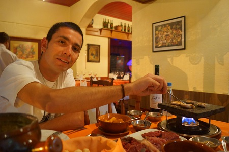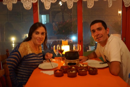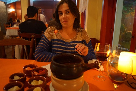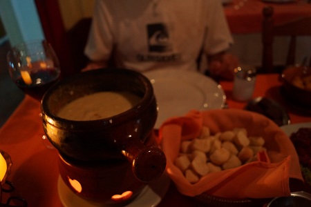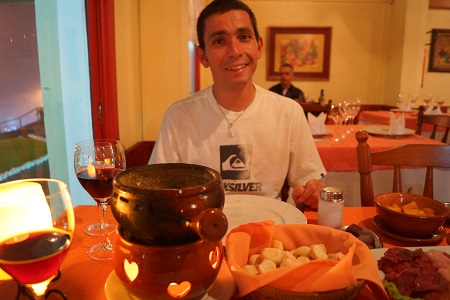 Assim que chegamos no restaurante nos ofereceram o carro chef da casa, o rodízio de fondue. Aceitamos a sugestão e encaramos o rodízio, nós nunca vimos tanta comida como hoje, o rodízio é composto por: Fondue de queijo com pão, goiabada, batata e polenta, depois um fondue de carnes bovinas, suínas e de frango com 15 tipos de molhos e no final um fondue de chocolate com 7 tipos de frutas. Agora imaginem tudo isso com direito a repetir o quanto você quiser! Ficamos preocupados com o preço que seria o jantar pois além do rodízio de fondue ainda fechamos uma garrafa de vinho, mas acreditem é muito mais barato do que um simples fondue em Campos do Jordão, SP.